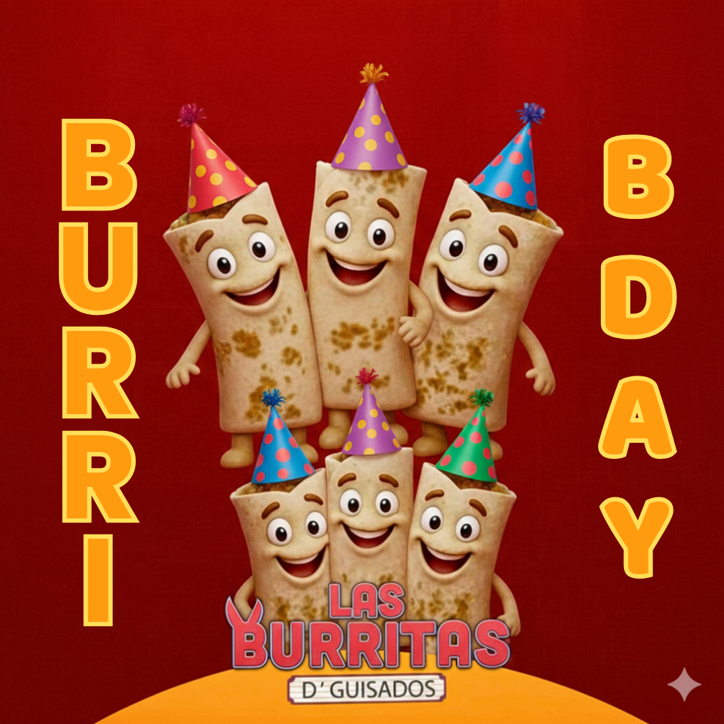 Ven a festejar tu cumple en las burritas con tres acompañantes y recibe de CORTESÍA 2 burritas + tu bebida favorita ❤️